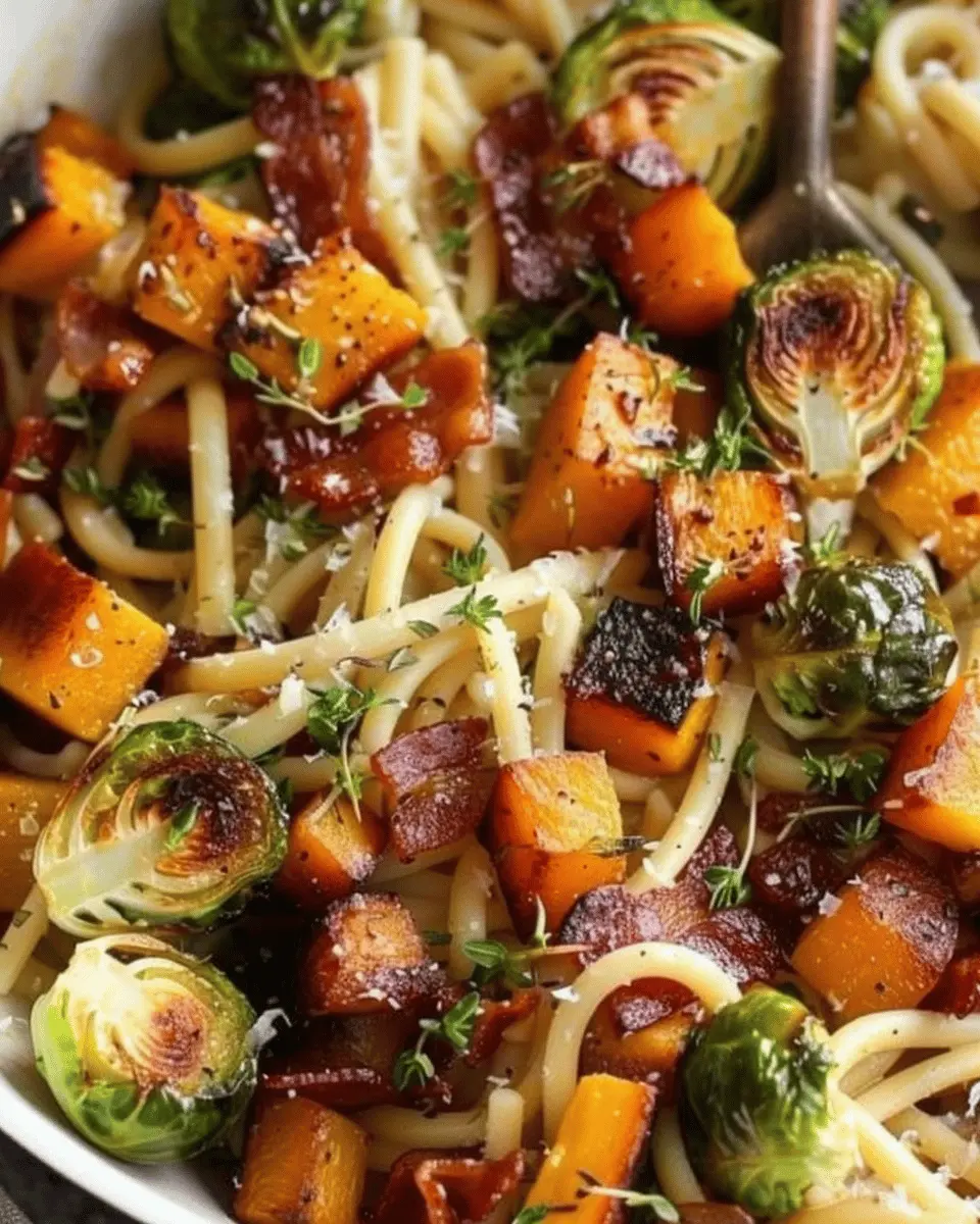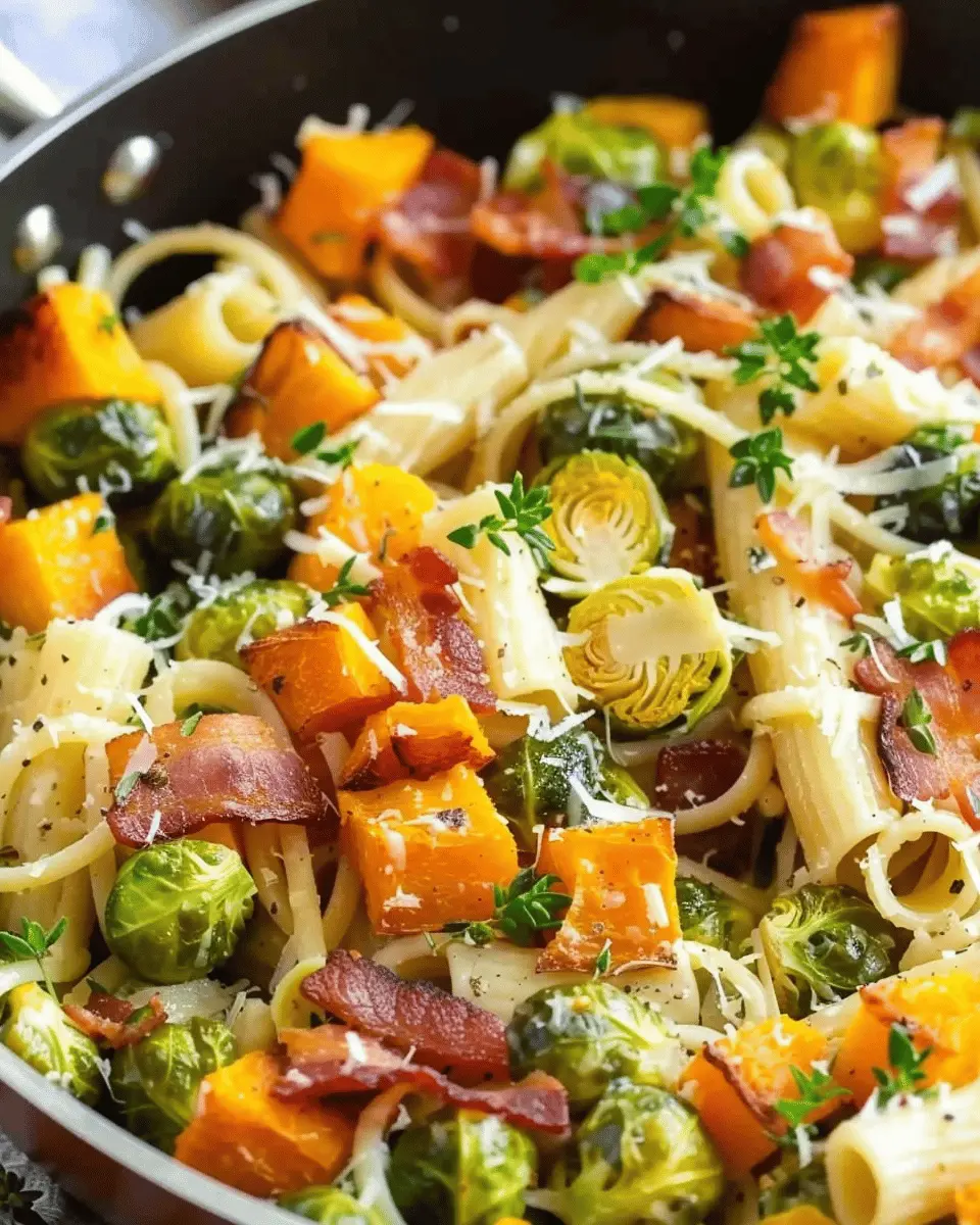A delicious and easy comfort food recipe combining bacon, Brussels sprouts, butternut squash, and pasta.