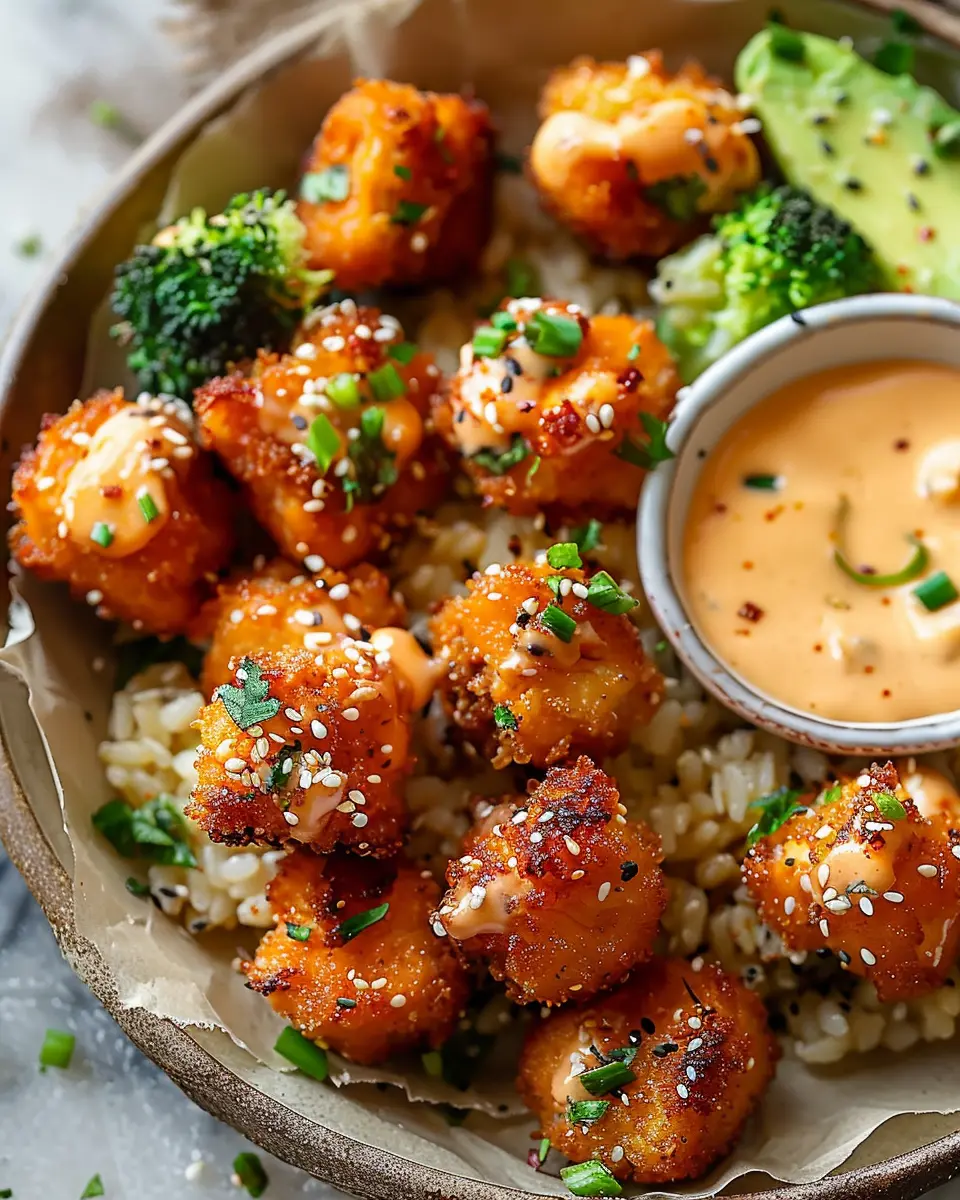 With your Bang Bang Salmon Bites cooked to perfection, it’s time for the fun part—assembling your bowls! Here’s a quick guide for a simple yet delicious bowl: