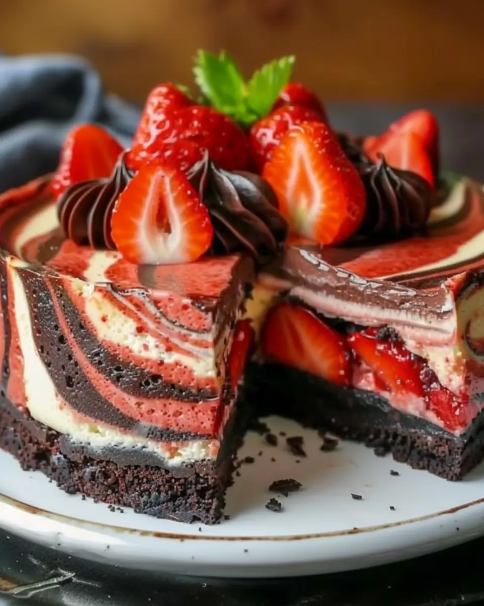 Imagine walking into a party and seeing a beautifully crafted cheesecake that blends chocolate and strawberries in a mesmerizing swirl. The aesthetic appeal is certainly one reason why this cheesecake is a favorite. Presentation matters, and this dessert steals the show with its eye-catching colors and enticing aroma.
