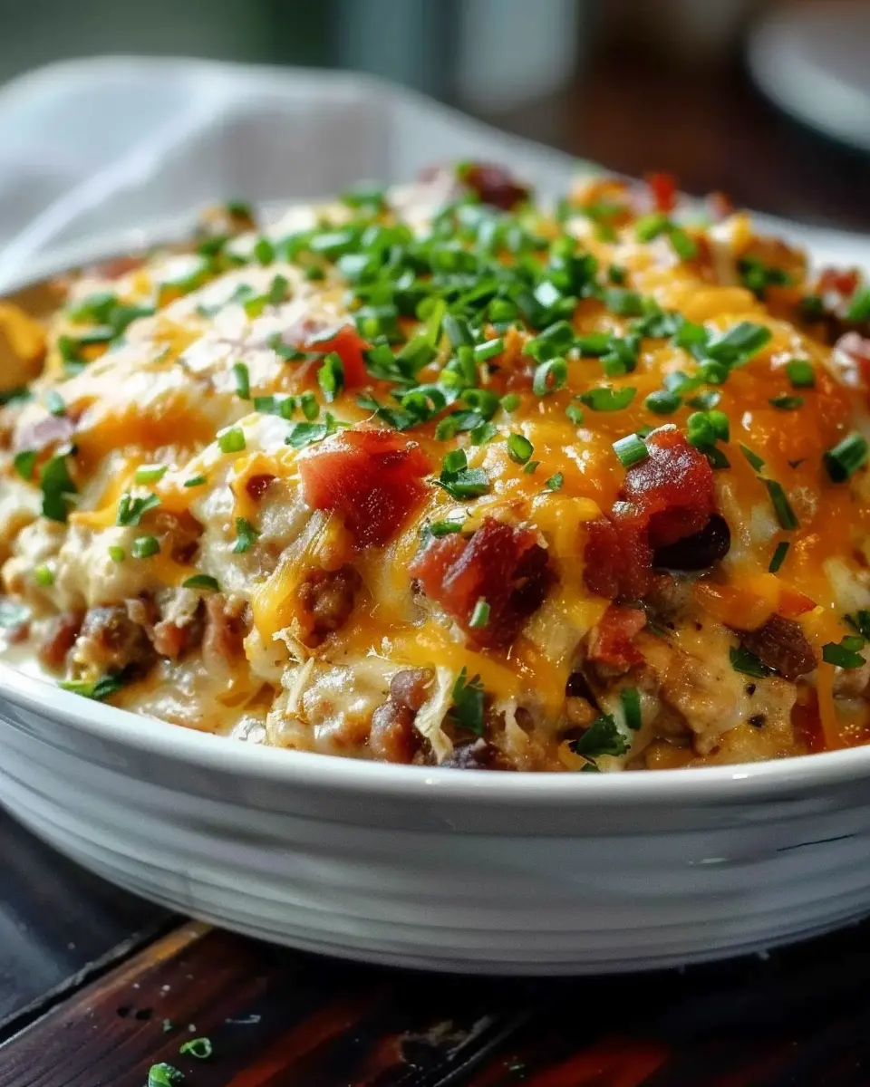 A hearty Cowboy Casserole featuring turkey bacon and chicken ham, perfect for a comforting meal.