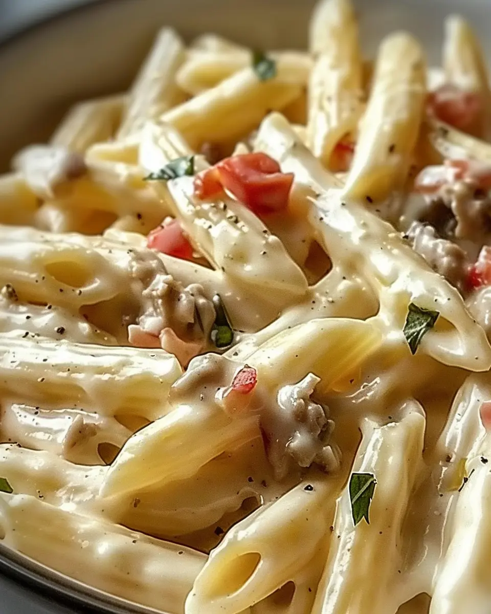 A delicious and indulgent creamy pasta dish featuring turkey bacon and chicken ham, perfect for a satisfying meal.