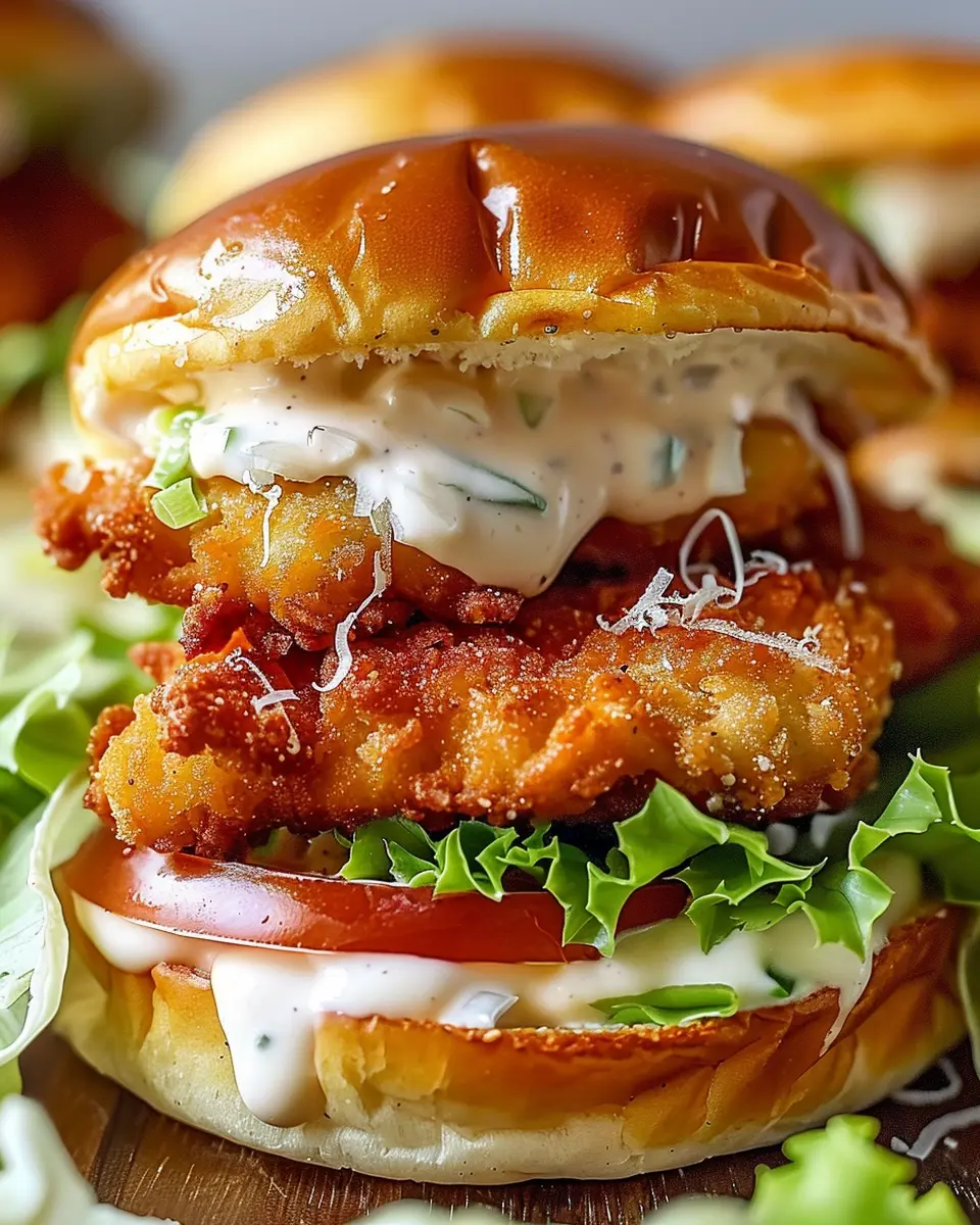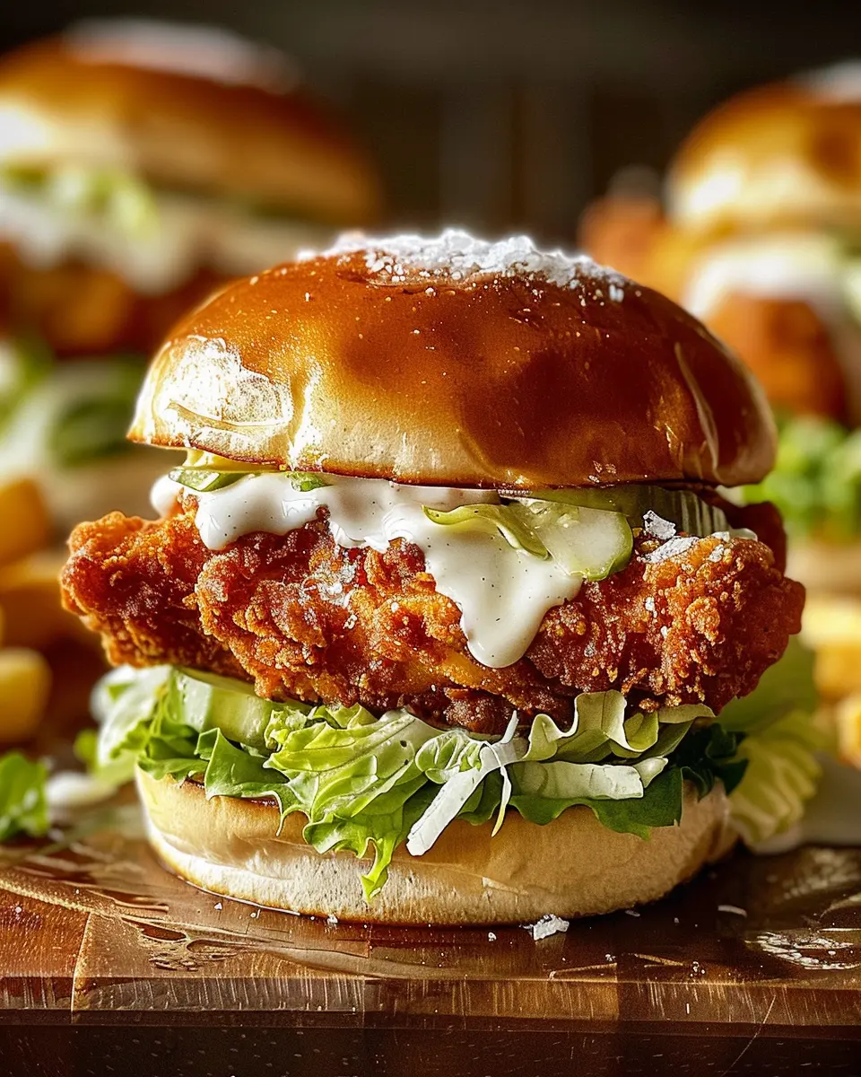 - Assemble the sandwich by layering the crispy chicken, bacon, lettuce, and Caesar dressing on the rolls.