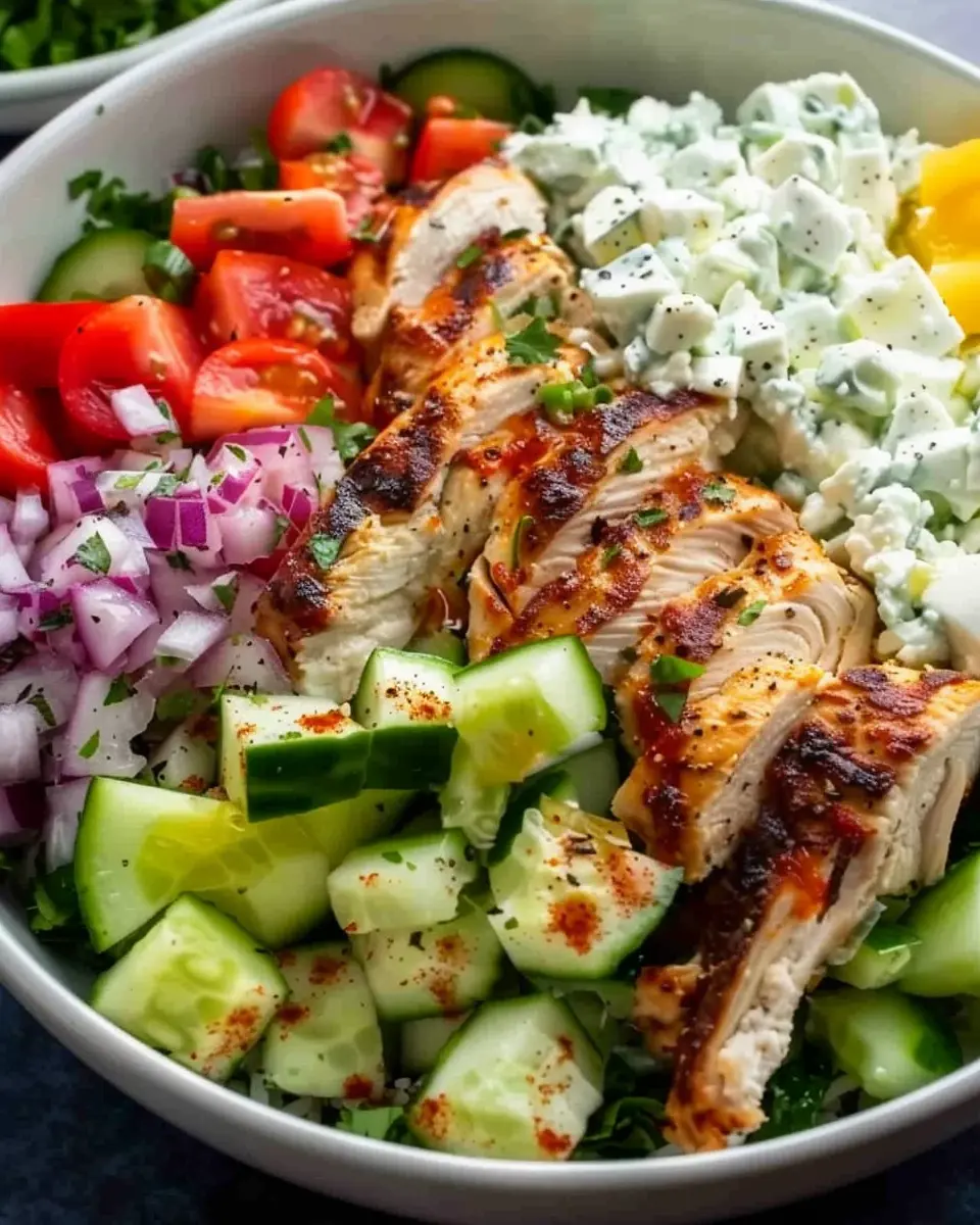 With all your components ready, it’s time to build your masterpiece. Start by placing a generous scoop of rice or quinoa in the bottom of a bowl. Layer on sliced grilled chicken, followed by a colorful array of fresh veggies. Top it off with a dollop of your homemade tzatziki sauce and a sprinkle of feta cheese if desired.