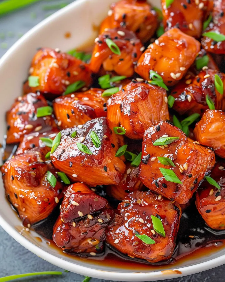 Enjoy these delicious and easy honey garlic salmon bites, perfect for a quick meal or appetizer!