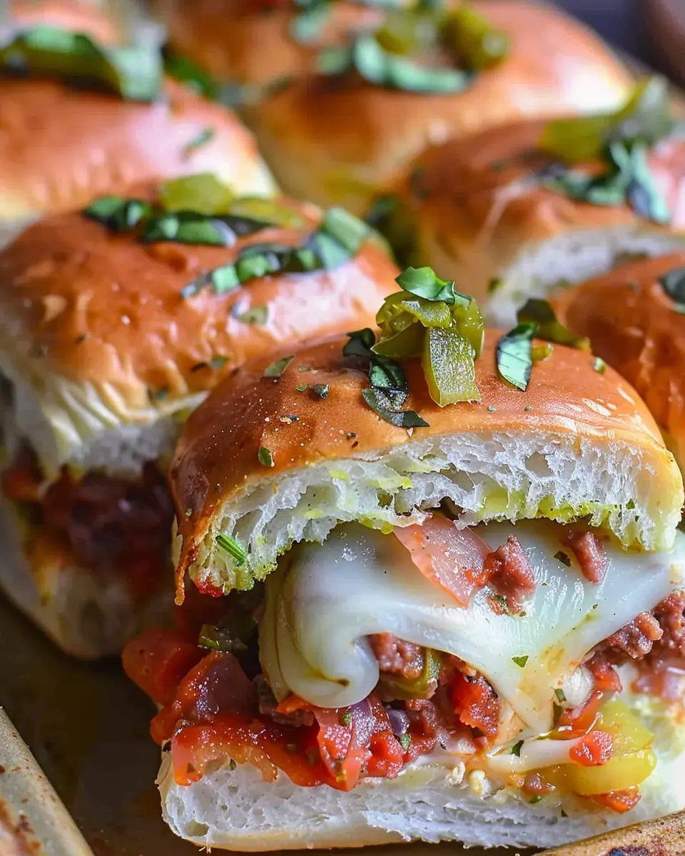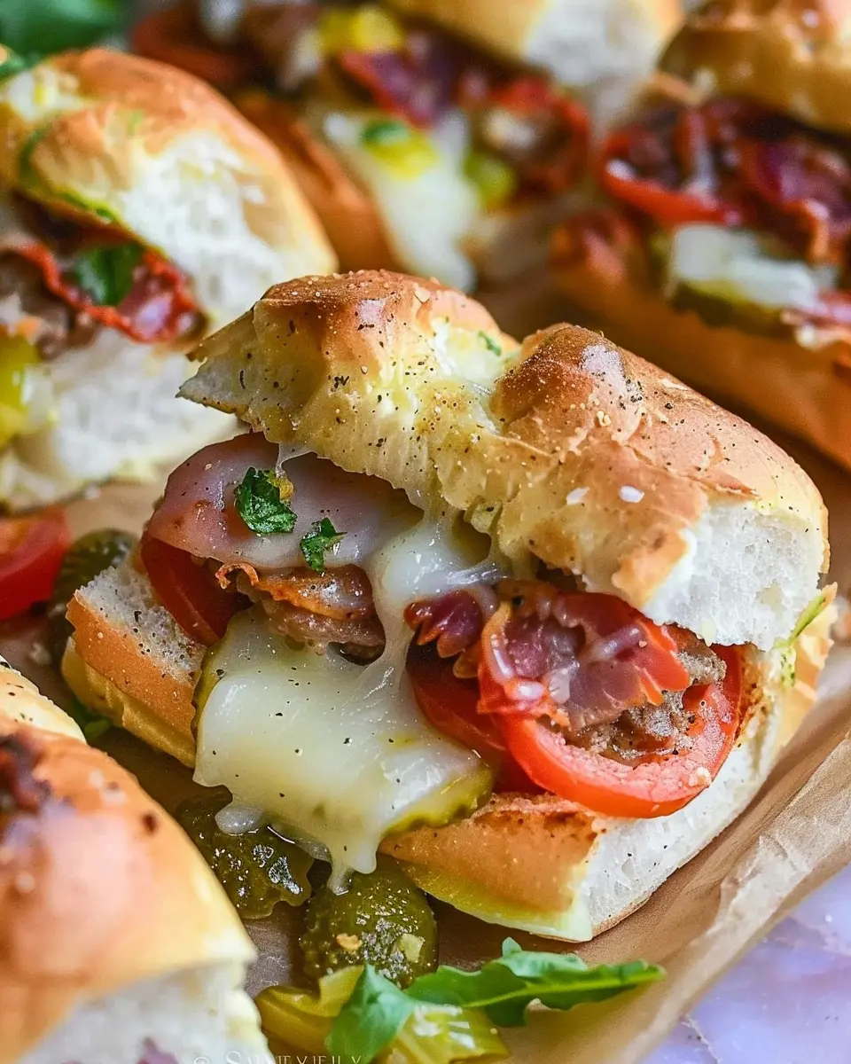 Enjoy the delicious flavors of Hot Italian Sub Sliders made with juicy turkey bacon and chicken ham. Perfect for gatherings!
