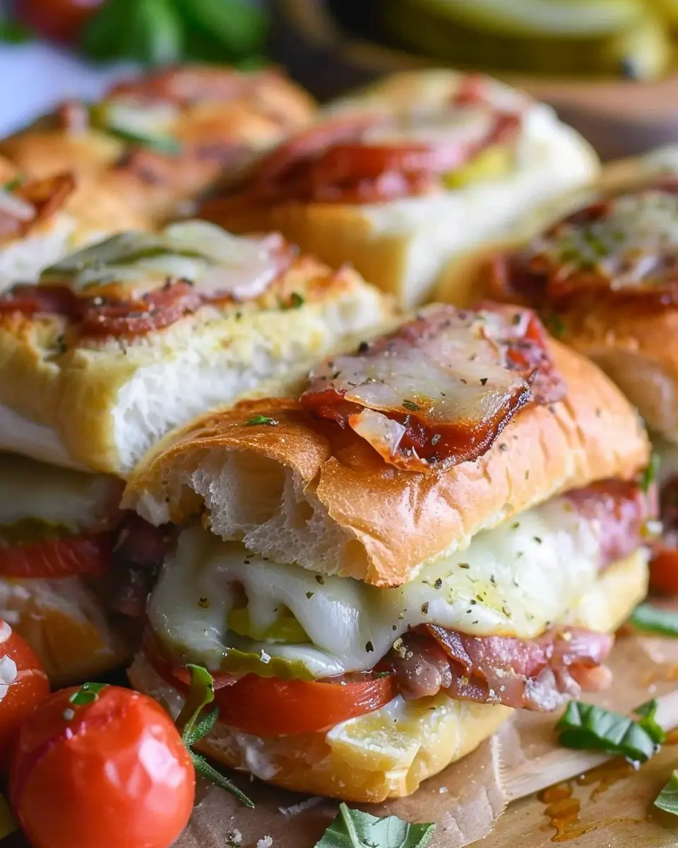 Delicious Hot Italian Sub Sliders featuring layers of turkey bacon and chicken ham, perfect for gatherings or a tasty meal.