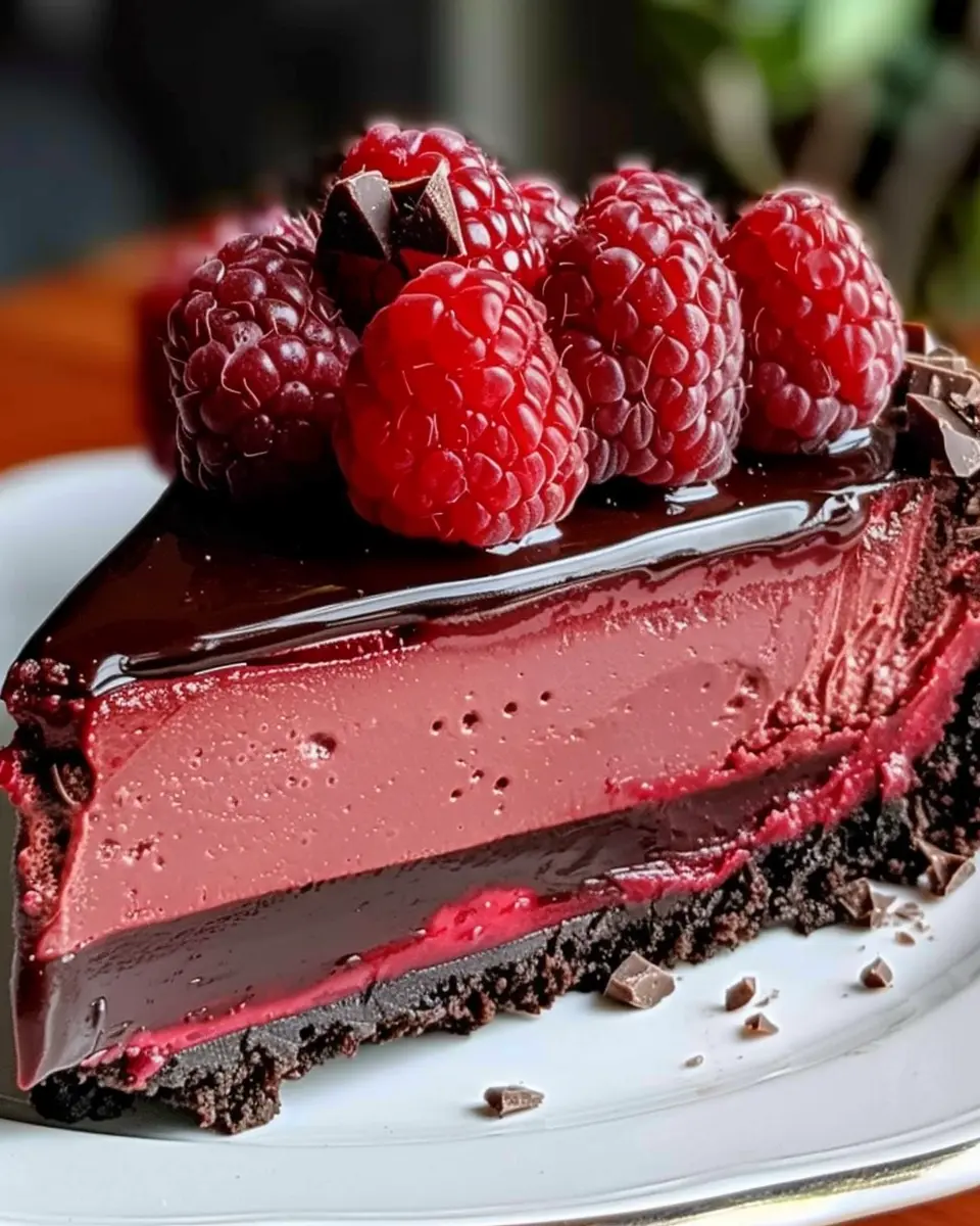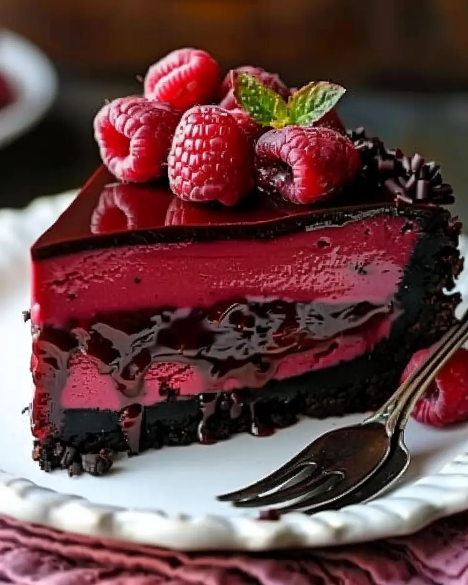 PrintIndulge in Decadent Dark Chocolate Raspberry Cheesecake Bliss