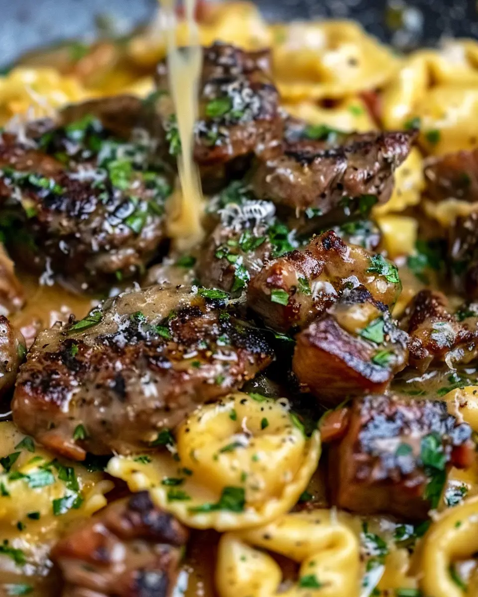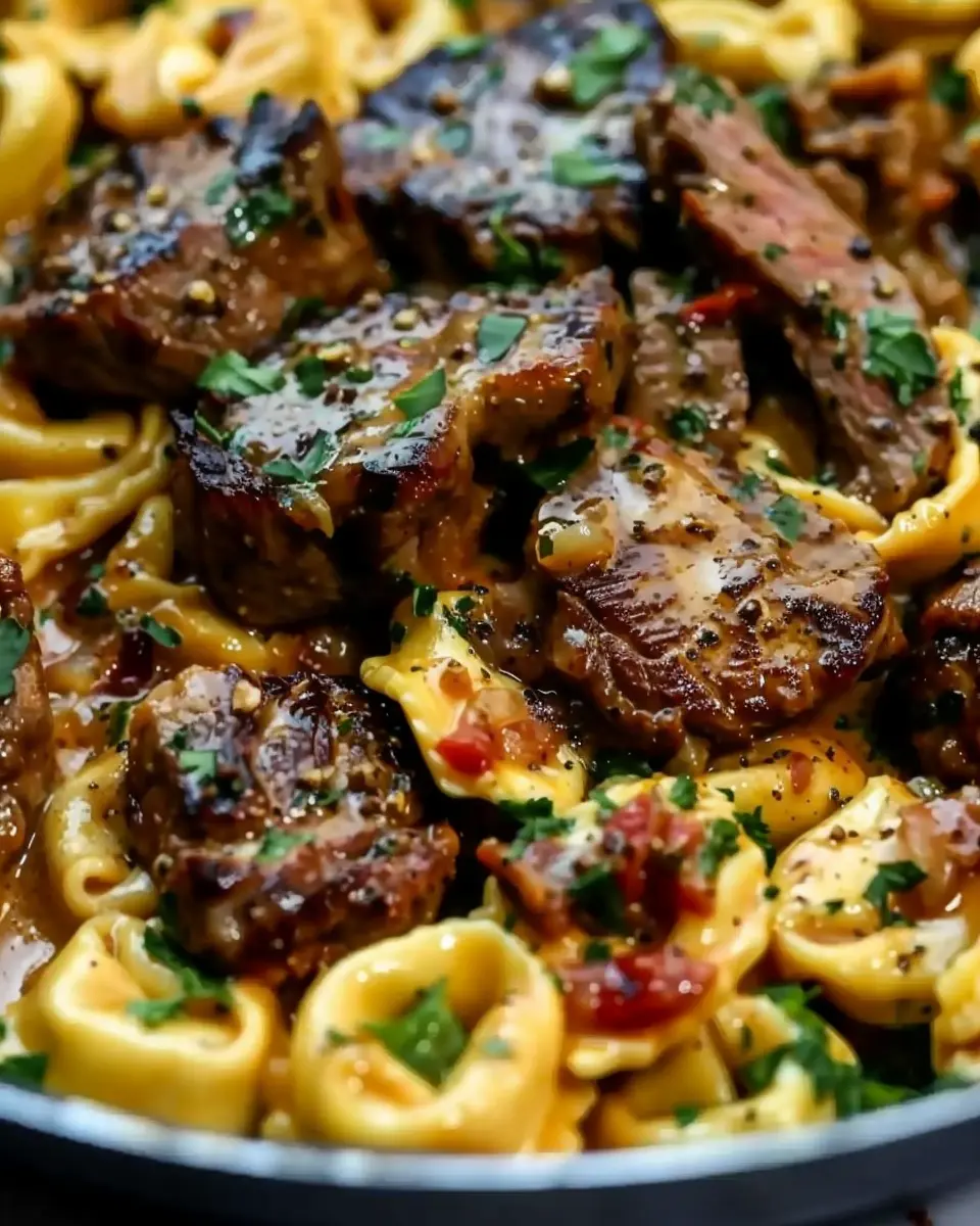 Add Tortellini: Toss the cooked tortellini into the same skillet with the steak pieces, along with any remaining cowboy butter sauce. Stir gently to ensure everything is coated nicely.