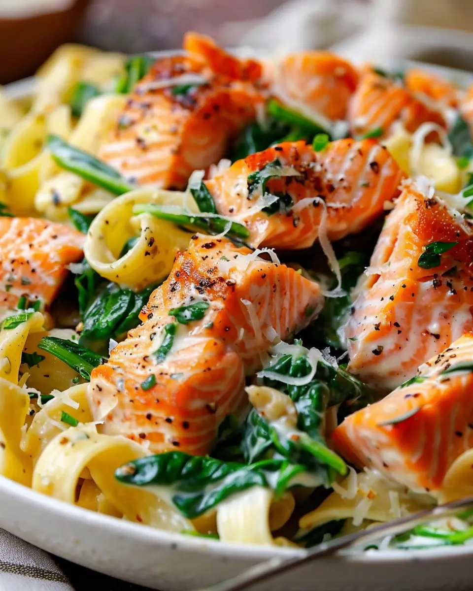 Absolutely! Preparing your salmon spinach pasta dish ahead of time is a great way to save time during busy weeknights. You can cook the pasta, salmon, and spinach, then combine them with the sauce. Simply store the dish in an airtight container in the refrigerator for up to 2 days. When you’re ready to enjoy it, just reheat on the stovetop or in the microwave, adding a splash of vegetable broth or cream to keep it from drying out.
