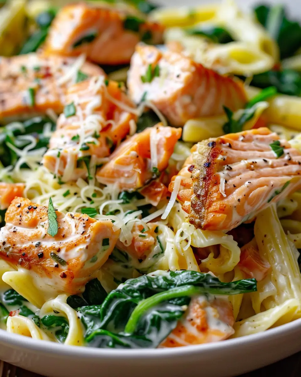A light yet satisfying dish that combines the richness of salmon with the freshness of spinach and the heartiness of pasta.