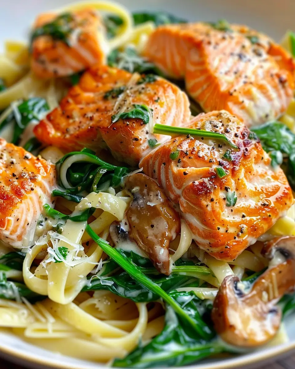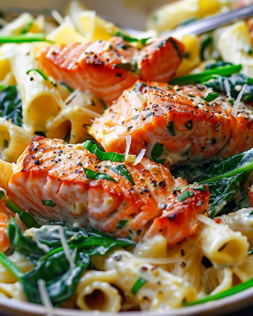 A delicious and nutritious salmon spinach pasta dish that is easy to prepare, perfect for a healthy dinner option.