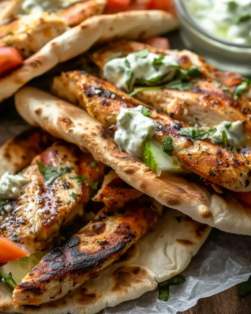 - Assemble pitas by adding chicken, tomatoes, cucumber, and a drizzle of tzatziki sauce.